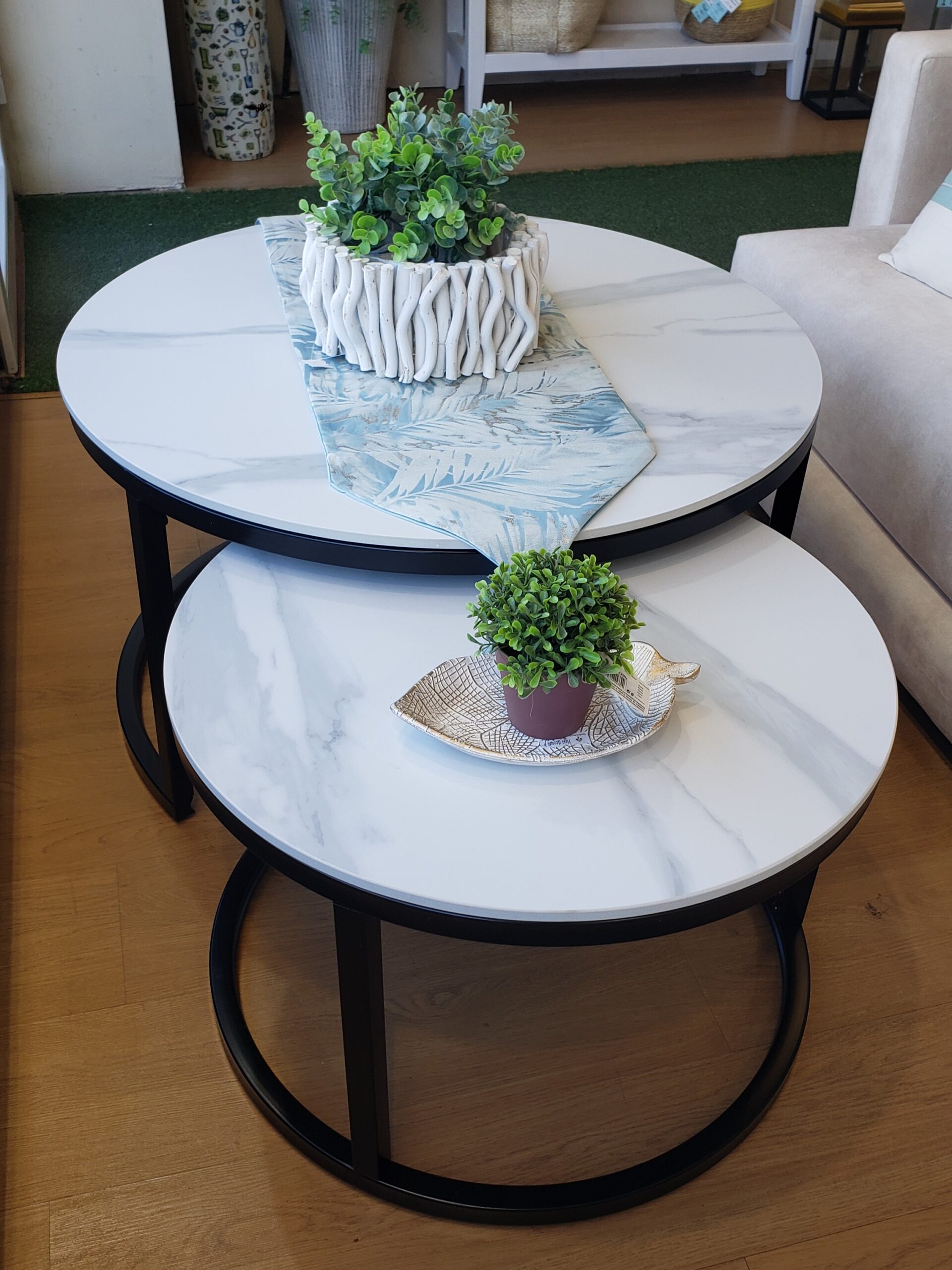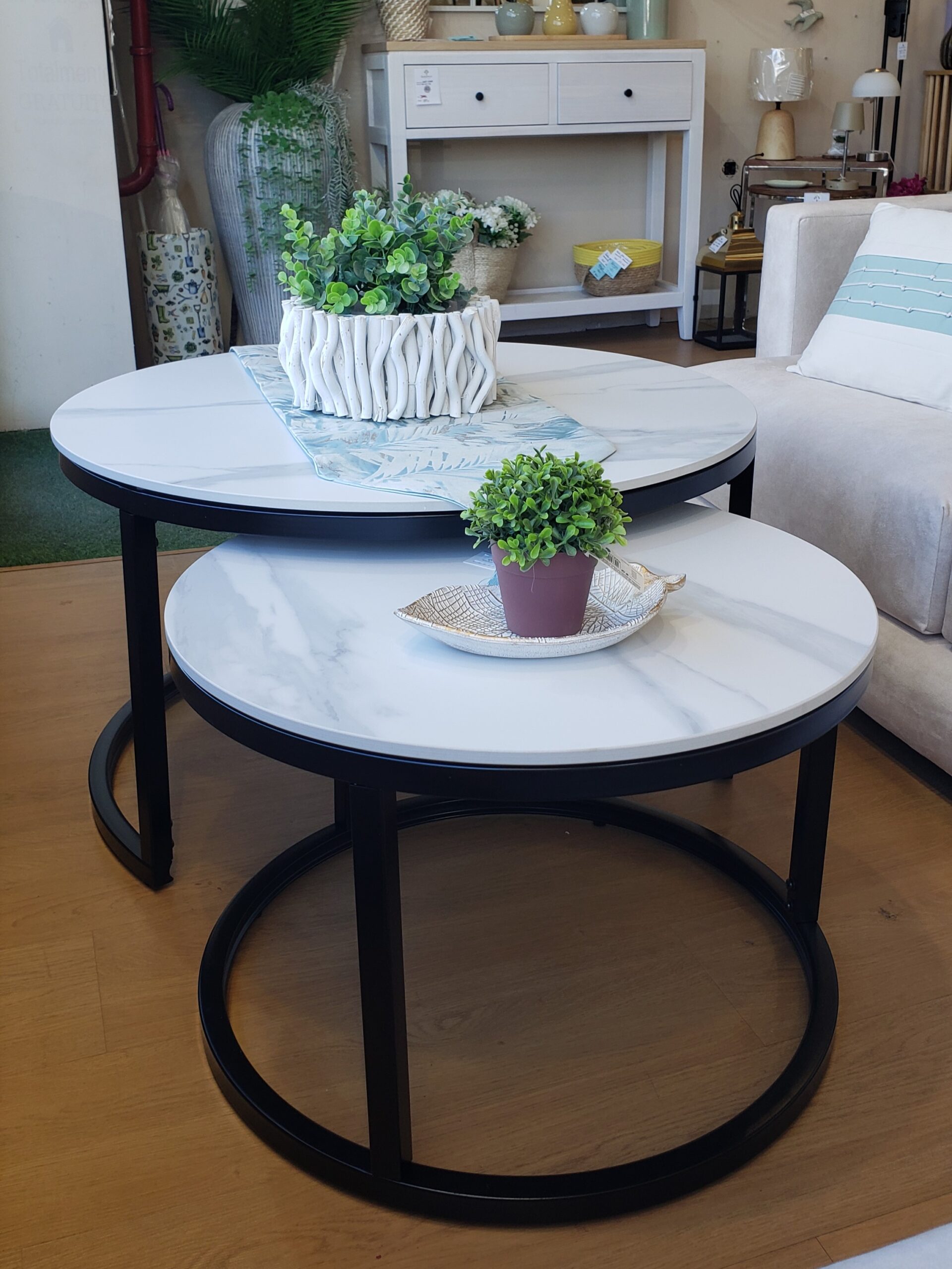 Set de 2 mesas de centro con tapas efecto mármol y patas en metal (opción negro o blanco).
