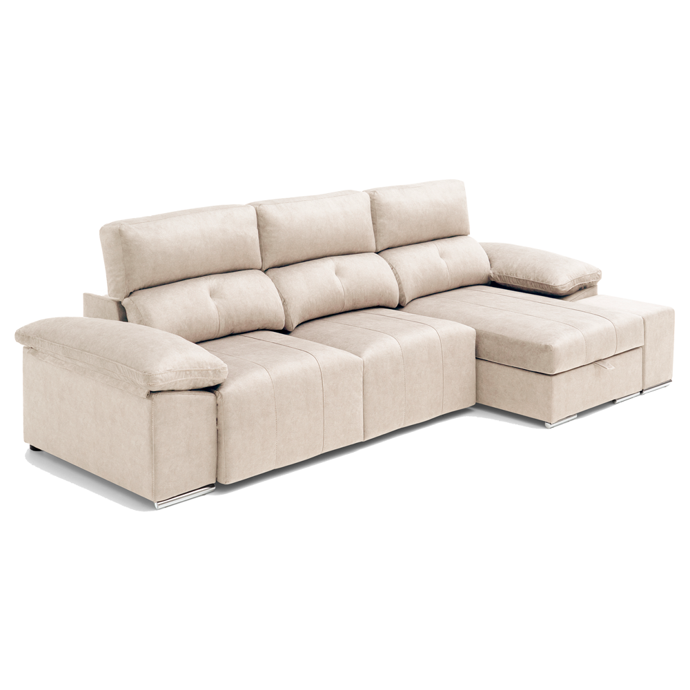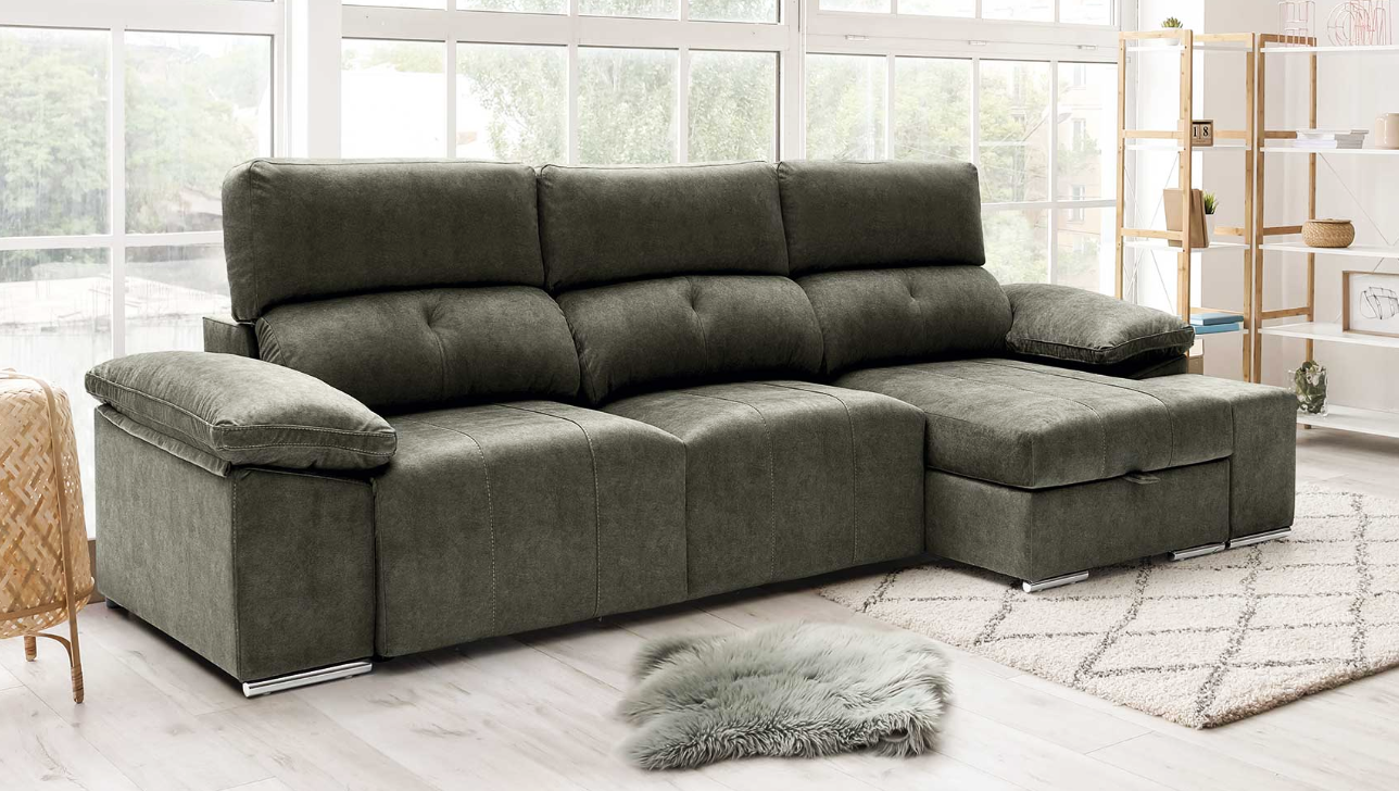 1.376,00€ – 1.556,00€Sofá 3 plazas más chaisselongue con deslizante de carro, arcón en chaisselongue, dos poufs en brazos más dos cojines decorativos. Asientos con 3,5cm de Viscoelástica y respaldo reclinable.